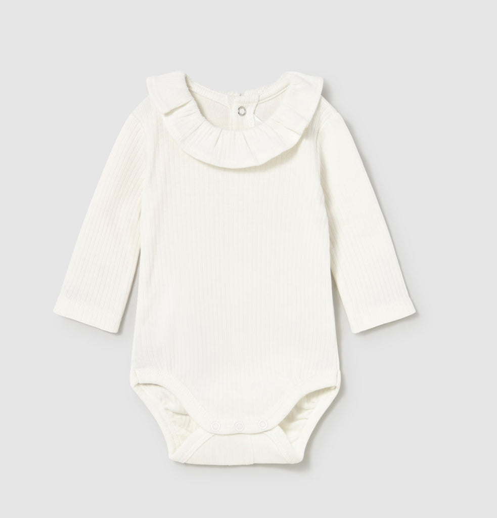 Long sleeved Bodysuits for newborn girls Round neckline with ruffles. Snap button fastening at the back.